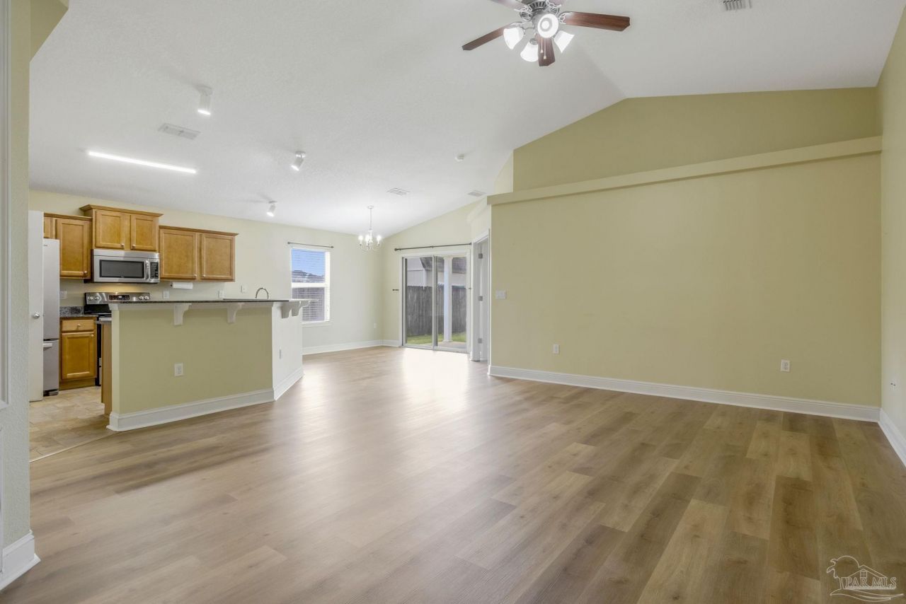 This inviting Pace home is ready and waiting! Vaulted ceilings and an open floorplan let light flood in, keeping everything bright and airy while the primary suite is split from the other two bedrooms allowing for maximum privacy. Brand new LVP flooring runs throughout for a fresh and cohesive look. The backyard is shaded by mature trees offering room to grow and loads of potential. This cozy neighborhood sits in a growing community only minutes from Whiting Field, Publix, Aldi and other great shopping and restaurant options. A new hot water heater was just installed, and the home has preexisting hurricane panels for peace of mind.